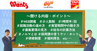 就職活動のい・ろ・は【企業選びに迷ったらココ!】 ~内容~ 1)『人事部が教える会社の見方』 ☆「会社情報の見方は?」「給与明細の見方は?」「福利厚生って何?」などなど ぼんやり知っているけど、今さら聞きにくい知識等をクイズ形式で楽しく勉強していきます♪ 2)『ドラッグストア業界研究』 ☆自分の将来像を描くには、まず業界の勉強をするのがオススメ! ドラッグストア業界の特徴、将来、求められる役割など詳しく説明します。 「ドラッグストアで働く薬剤師ってどんな人?」 そんな方は是非一度聞いてみてください! 自分の思い描く薬剤師の将来像が、クリアになってくるはず♪ 尚、少人数制で実施するため 参加される方の聞きたい内容によって、当日の内容が変更となる場合がございます。 聞いてみたいことがあれば、何でも聞いてみてくださいね! |